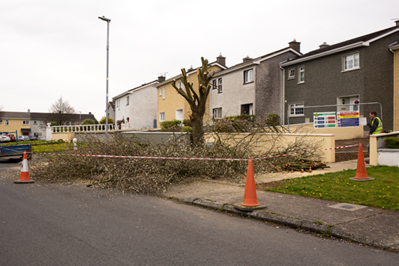 MacEoin Park, Longford Town, County Longford, a large estate of 129 houses, built in the 70’s, there is a manicuring job happening now with many trees that were place around the estate. This tree the latest, talking to a local resident, he explained not before time, some of the trees block out a lot of light in full foliage. but he told me of the time they were not long planted and that one tree that would have been not far from this tree in image below. Two former army men were chatting, one had had a tipple, leaning on a newly planted tree, slowly but surely to the point where both were on the ground parallel, that tree died.